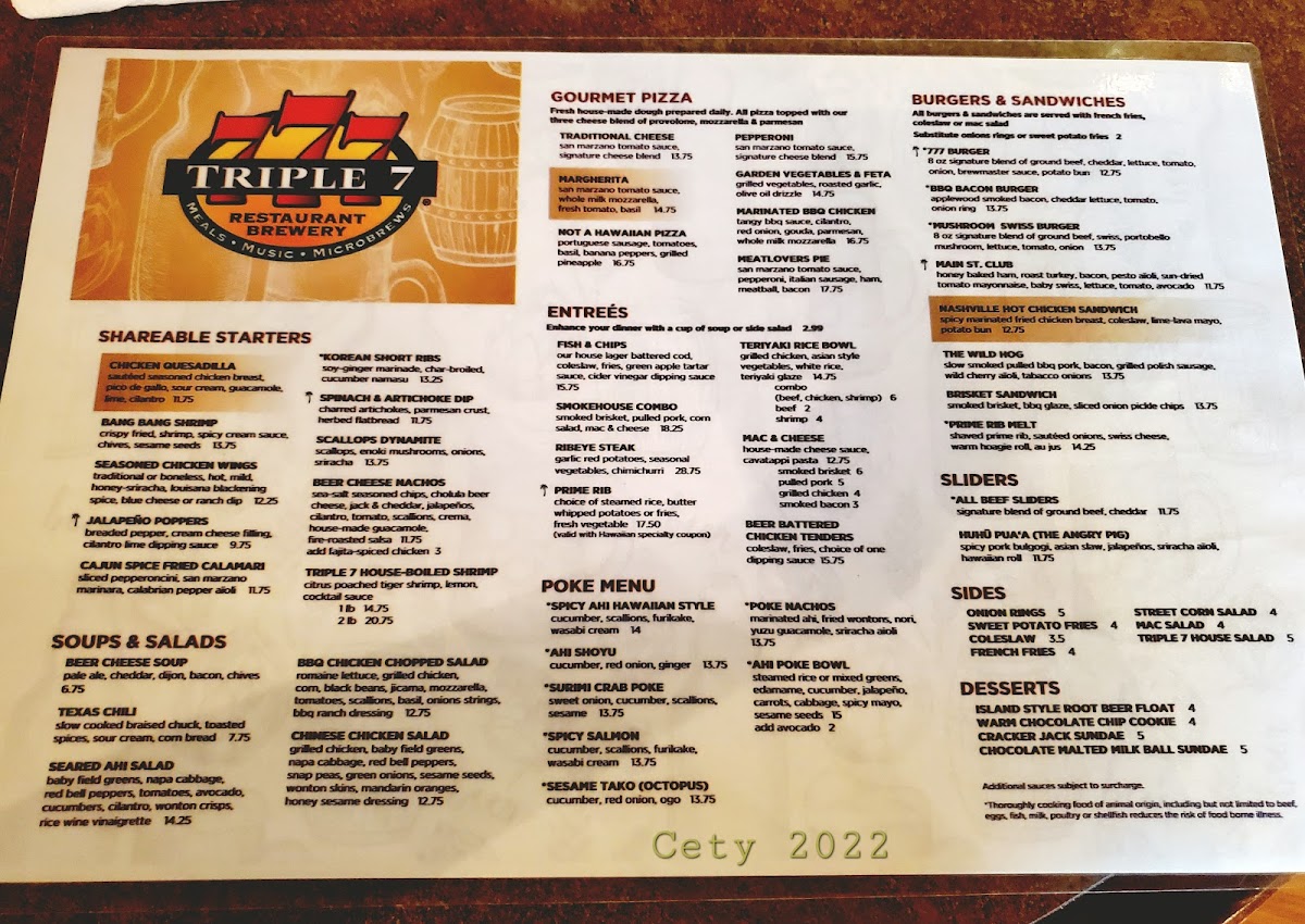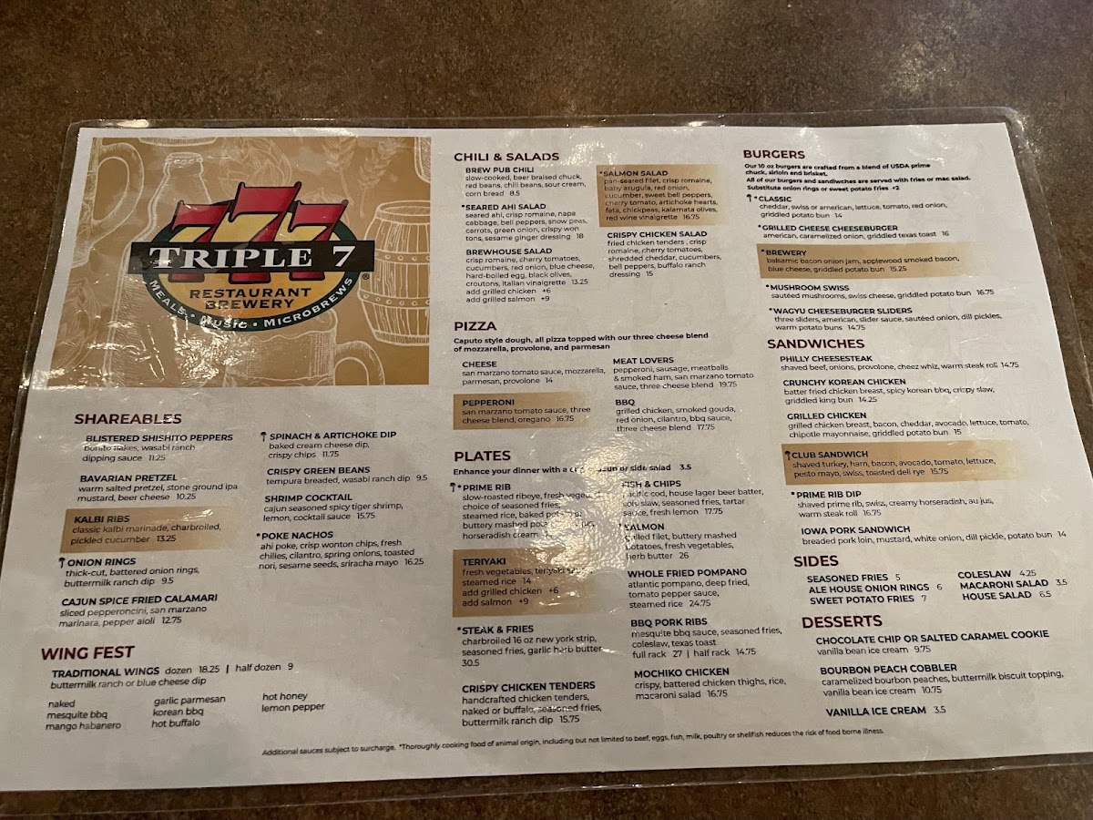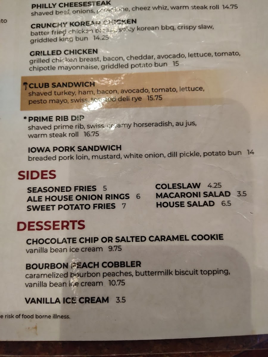 - Main Courses: Entrées include prime rib served with baked potato and vegetables, full rack BBQ ribs, mac and cheese, Philly cheesesteak, club sandwich, Iowa pork sandwich, and California roll, covering a broad spectrum of hearty meal options.
