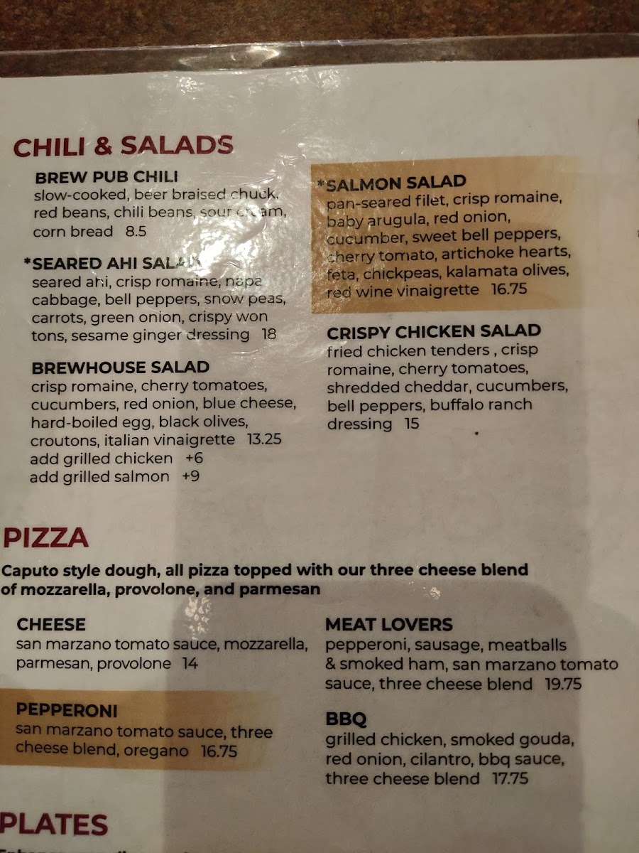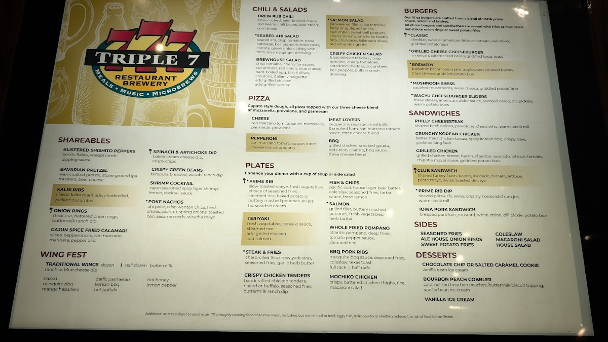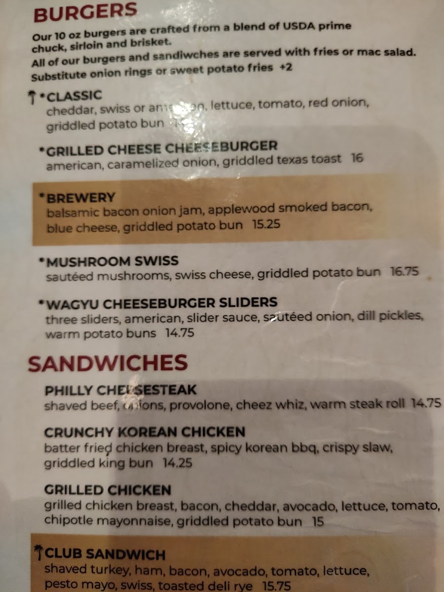 This menu supports casual dining experiences and can accommodate guests seeking anything from light snacks and appetizers to full dinner entrees accompanied by craft beers brewed on the premises.