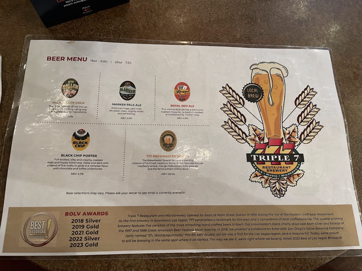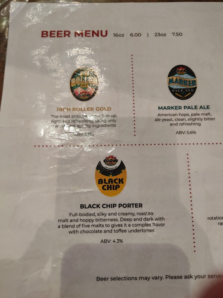 - Beers: The microbrewery offers several craft beers including High Roller Gold (ABV 5.0%), Marker Pale Ale (ABV 5.6%), Royal Red Ale (ABV 4.5%), and Black Chip Porter (ABV 4.3%), providing a range of light, refreshing, and fuller-bodied options.